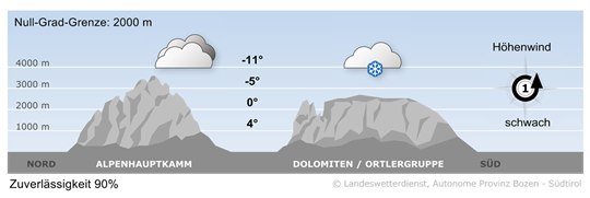 Der Tag verläuft stark bewölkt und gebietsweise kann es leicht regnen. Die Schneefallgrenze liegt zwischen 1300 m bis 1600 m. Die Höchstwerte reichen von 3° bis 7°.