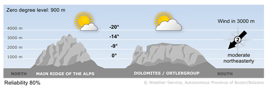 In the afternoon, the weather will be sunny in the western groups while more intense clouds will persist in the Dolomites. Temperatures very low. Winds from the north weakening.