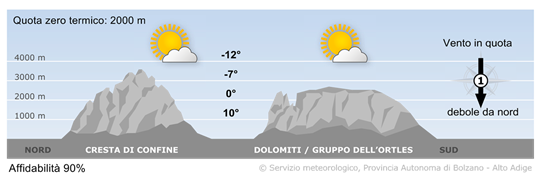 Clima fresco e ventoso: Giovedì il cielo sarà molto nuvoloso con venti forti e freddi da nord. Inizialmente a nord e est ci saranno delle nevicate mentre in giornata le precipitazioni interesseranno solo la cresta di confine. Limite delle nevicate tra 700 e 1000 m. Anche venerdì il vento rimarrà forte da nord. Sui settori più settentrionali saranno ancora possibili dei rovesci nevosi mentre verso sud ci saranno tratti soleggiati. Per sabato si prevedono buone condizioni con tempo in prevalenza soleggiato. Nelle valli soffierà ancora il Föhn da nord, ancora a tratti rafficato, tenderà ad attenuarsi. Domenica aumento della nuvolosità lungo la cresta di confine, verso sud tempo buono con alternanza tra sole e nubi. Föhn ancora presente.